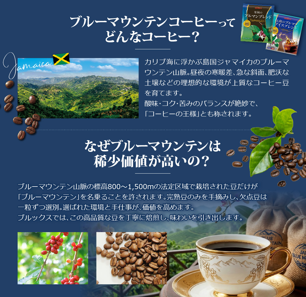 優れたバランスと味わいで絶大な人気を誇る、高級銘柄「ブルーマウンテン」と、厳選したアラビカ豆のみを使用し、”急冷式”で楽しめるドリップバッグコーヒーに仕上げました。