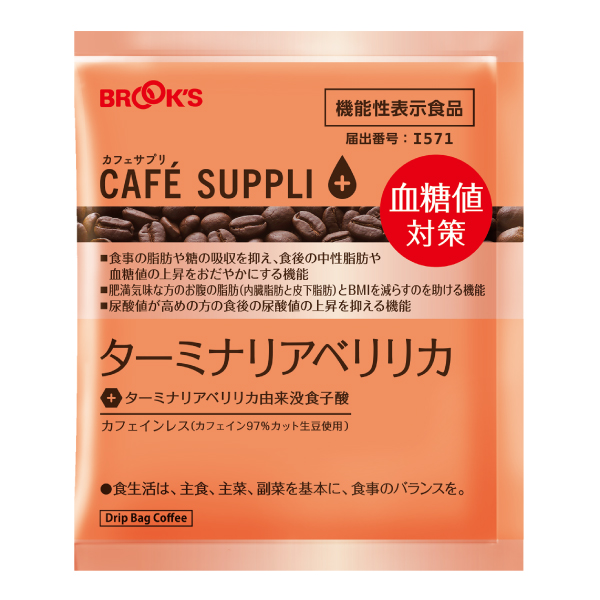 「カラダ」と「ココロ」の健康をサポートする健康応援コーヒー、カフェサプリシリーズのひとつ「ドリップバッグ カフェサプリ ターミナリアベリリカ」は、機能性関与成分「ターミナリアベリリカ由来没食子酸」を摂取できるカフェインレスコーヒーです。